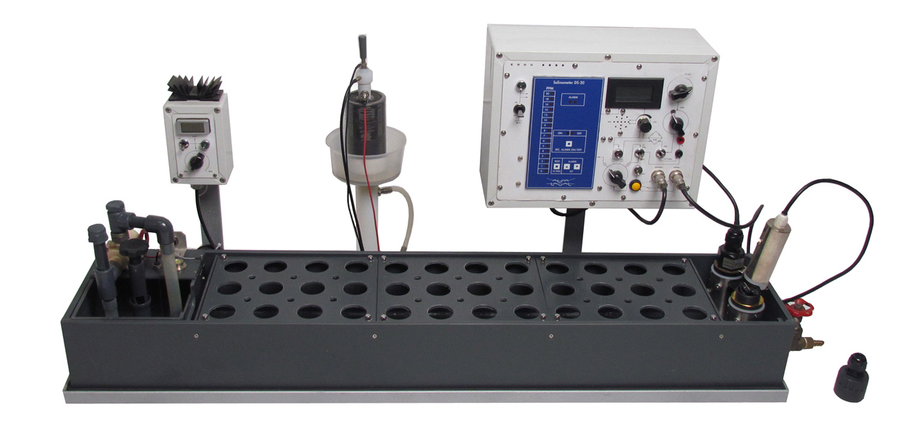 After assembling the electrodes and electronic cards, the probes are placed on a tank containing continuously flowing demineralised water. Every single probe is checked and tested in order to deliver perfectly working parts to the customer. In order to test the final products we have designed and manufactured a special salinometer that conducts quality tests on the probes, guaranteeing safe and constant operating precision. To keep the salt content in the tank constant, we have designed and manufactured an electrolytic dialyzer, which stabilizes the salt concentration in the water at a value of about 10 ppm.
